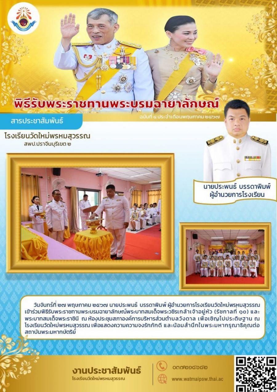 นายประพนธ์ บรรดาพิมพ์ ผู้อำนวยการโรงเรียนวัดใหม่พรหมสุวรรณเข้าร่วมพิธีรับพระราชทานพระบรมฉายาลักษณ์พระบาทสมเด็จพระวชิรเกล้าเจ้าอยู่หัว (รัชกาลที่ ๑๐) และพระบาทสมเด็จพระราชินี ณ ห้องประชุมสภาองค์การบริหารส่วนตำบลวังดาล เพื่อเชิญไปประดิษฐาน ณโรงเรียนวัดใหม่พรหมสุวรรณ เพื่อแสดงความความจงรักภักดี และน้อมสำนึกในพระมหากรุณาธิคุณต่อสถาบันพระมหากษัตริย์ S:0
