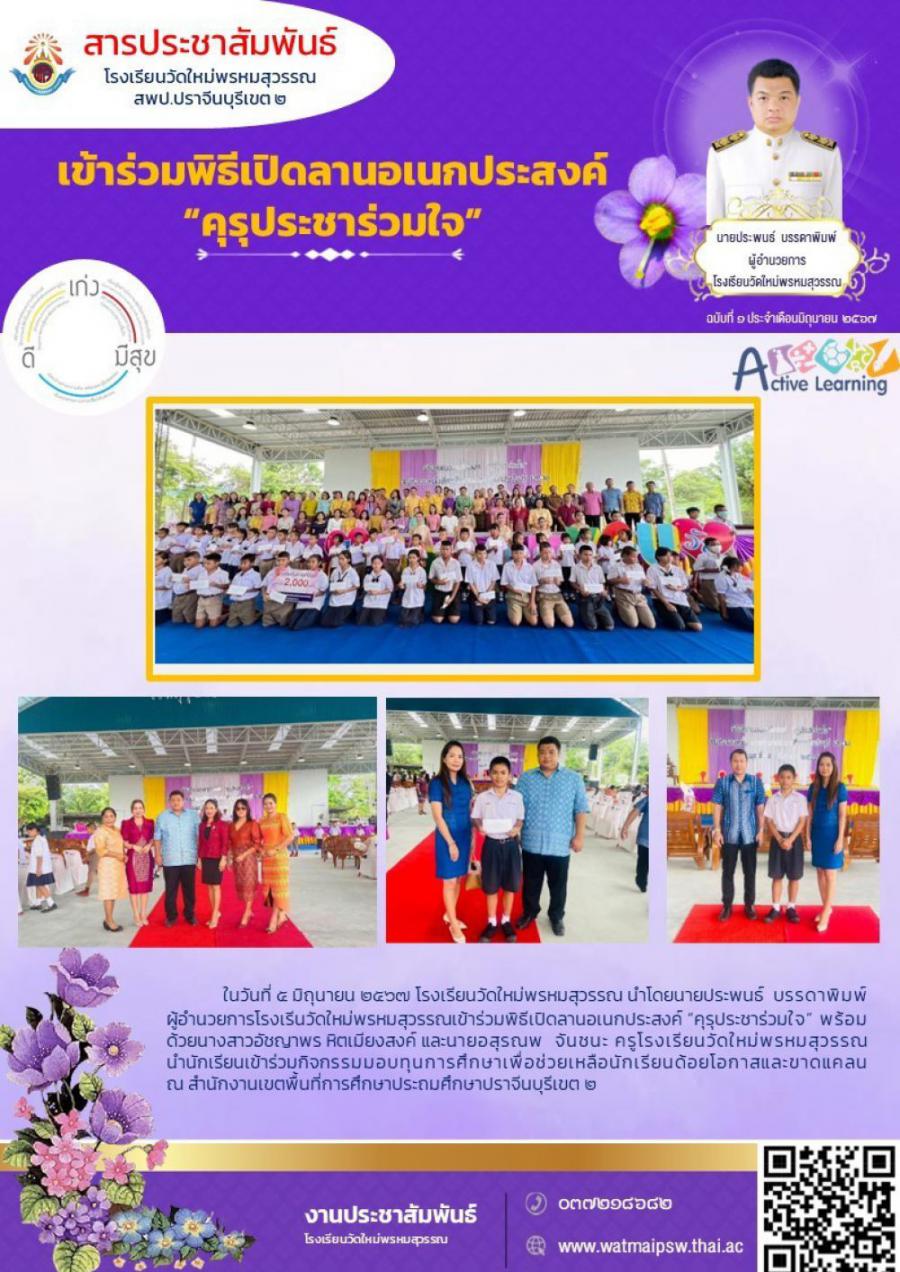 ในวันที่๕ มิถุนายน๒๕๖๗ โรงเรียนวัดใหม่พรหมสุวรรณ นำโดยนายประพนธ์ บรรดาพิมพ์ผู้อำนวยการโรงเรีนวัดใหม่พรหมสุวรรณเข้าร่วมพิธีเปิดลานอเนกประสงค์ "คุรุประชาร่วมใจ" พร้อม ด้วยนางสาวอัชญาพร หิตเมียงสงค์ และนายอสุรณพ จันชนะ ครูโรงเรียนวัดใหม่พรหมสุวรรณนำนักเรียนเข้าร่วมกิจกรรมมอบทุนการศึกษาเพื่อช่วยเหลือนักเรียนด้อยโอกาสและขาดแคลนณ สำนักงานเขตพื้นที่การศึกษาประถมศึกษาปราจีนบุรีเขต ๒ S:0