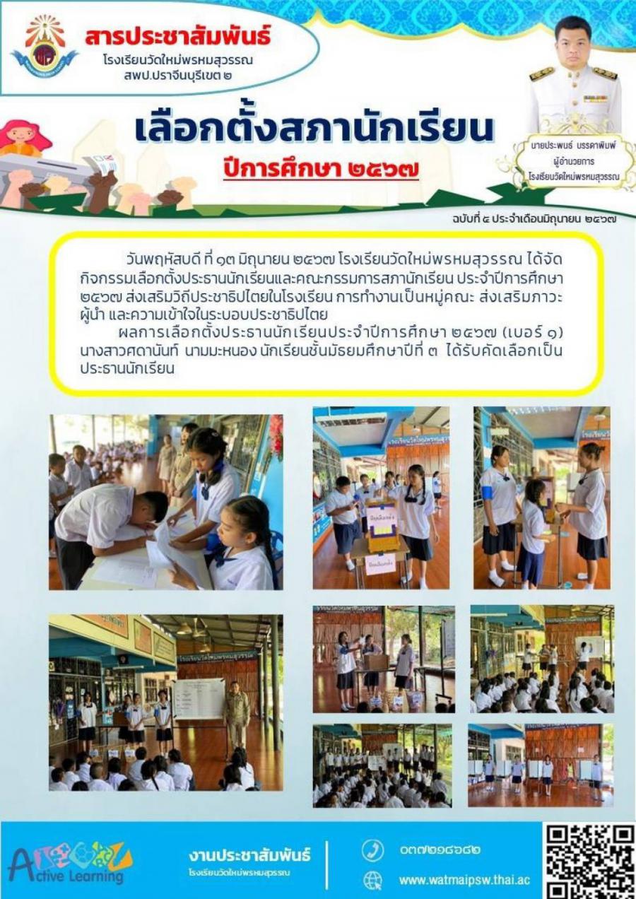 วันพฤหัสบดี ที่๑๓ มิถุนายน๒๕๖๗ โรงเรียนวัดใหม่พรหมสุวรรณ ได้จัด กิจกรรมเลือกตั้งประธานนักเรียนและคณะกรรมการสภานักเรียน ประจำปีการศึกษา ๒๕๖๗ ส่งเสริมวิถีประชาธิปไตยในโรงเรียน การทำงานเป็นหมู่คณะ ส่งเสริมภาวะ ผู้น้ำ และความเข้าใจในระบอบประชาธิปไตย ผลการเลือกตั้งประธานนักเรียนประจำปีการศึกษา๒๕๖๗ (เบอร์ ๑) นางสาวศดานันท์ นามมะหนอง นักเรียนชั้นมัธยมศึกษาปีที่ ๓ ได้รับคัดเลือกเป็นประธานนักเรียน S:0