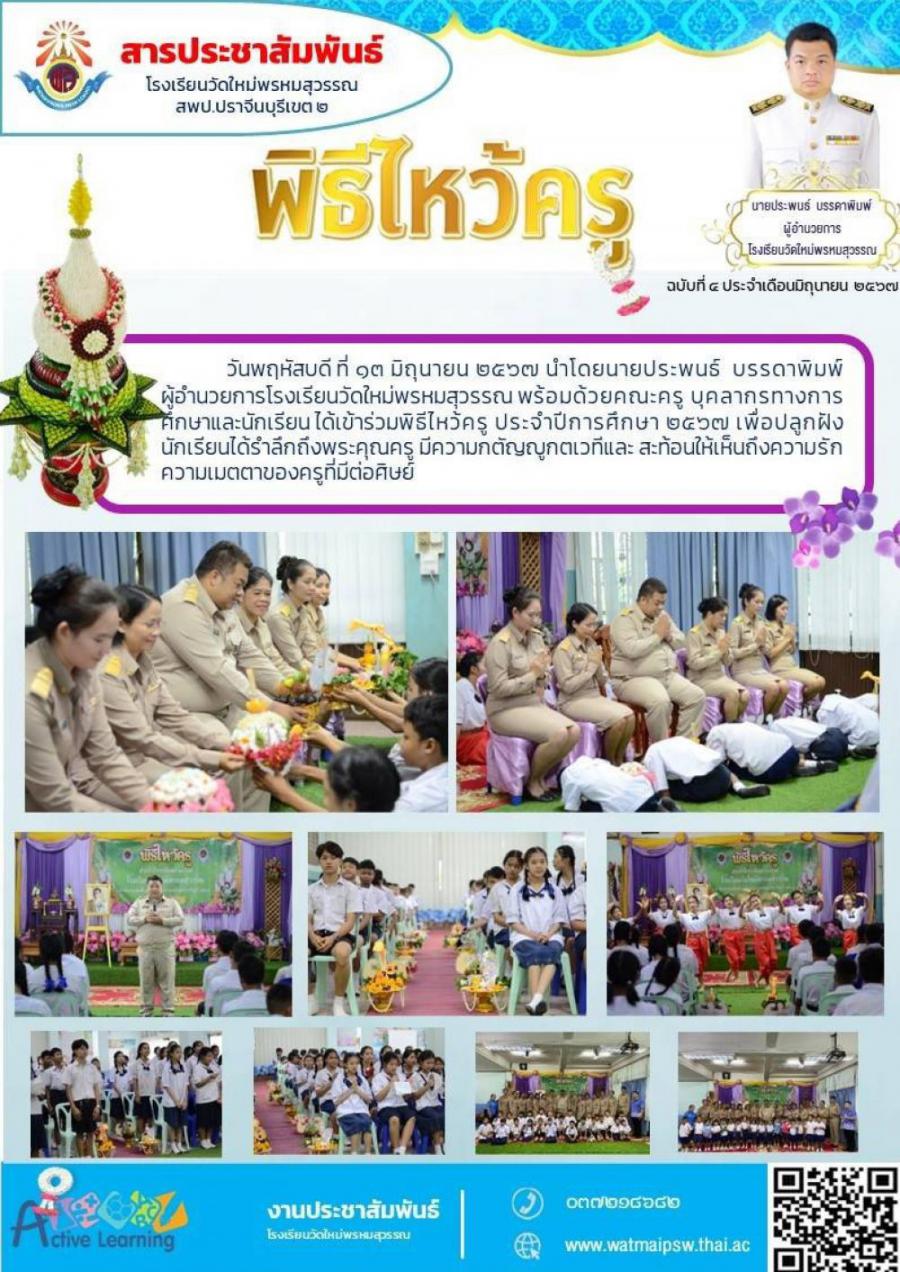 วันพฤหัสบดี ที่ ๑๓ มิถุนายน ๒๕๖๗ นำโดยนายประพนธ์ บรรดาพิมพ์ผู้อำนวยการโรงเรียนวัดใหม่พรหมสุวรรณ พร้อมด้วยคณะครู บุคลากรทางการ ศึกษาและนักเรียน ได้เข้าร่วมพิธีไหว้ครู ประจำปีการศึกษา ๒๕๖๗ เพื่อปลูกฝัง นวานมตตาของครูที่ต่อกับรู้มีความกตัญญกตเวที่และสะก้อนให้เห็นถึงความรั S:0