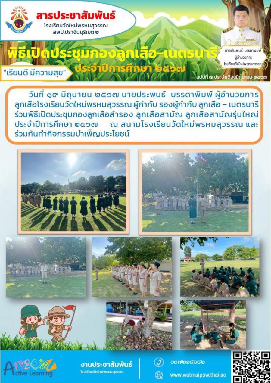 วันที่ ๑๙ มิถุนายน ๒๕๖๗ นายประพนธ์ บรรดาพิมพ์ ผู้อำนวยการ ลูกเสือโรงเรียนวัดใหม่พรหมสุวรรณ ผู้กำกับ รองผู้กำกับ ลูกเสือ - เนตรนารีร่วมพิธีเปิดประชุมกองลูกเสื้อสำรอง ลูกเสือสามัญ ลูกเสือสามัญรุ่นใหญ่ ประจำปีการศึกษา ๒๔๖๗ ณ สนามโรงเรียนวัดใหม่พรหมสุวรรณ และ ร่วมกันทำกิจกรรมบำเพ็ญประโยชน์ S:0