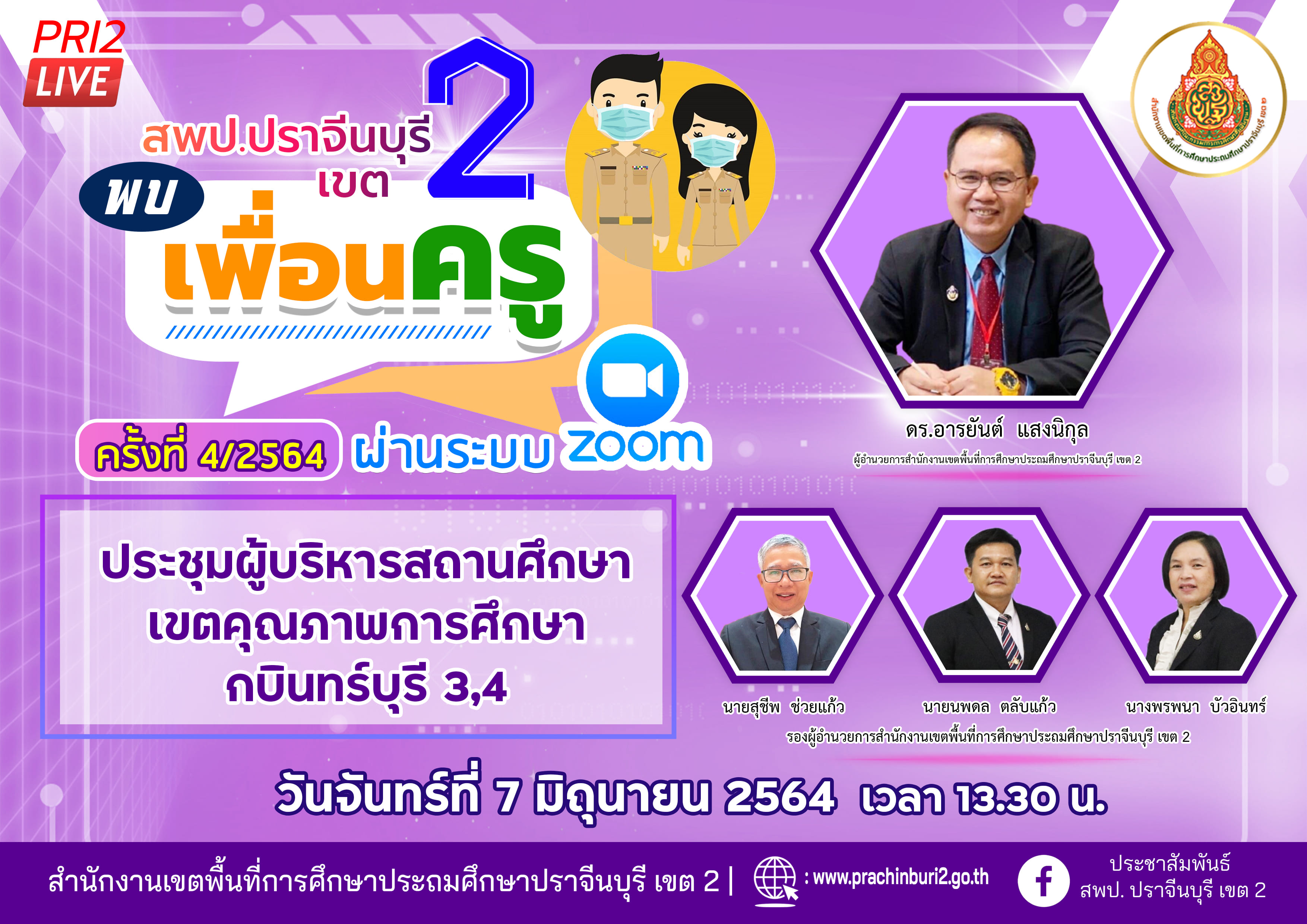 นายมานพ  นวลสนิท ผู้อำนวยการโรงเรียน คณะครูและบุคลากรทางการศึกษา เข้าร่วมการประชุม สพป.ปราจีนบุรี เขต 2 พบเพื่อนครู ครั้งที่ 4/2564 ผ่านระบบ Zoom ในวันที่ 7 มิถุนายน 2564 เวลา 13.30 น. ณ ห้องประชุมโรงเรียนวัดใหม่พรหมสุวรรณ