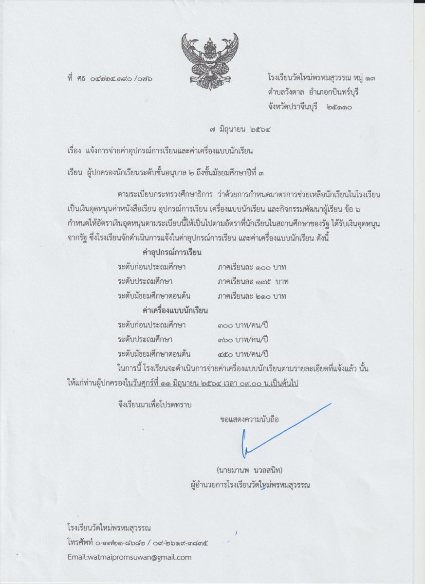 แจ้งการจ่ายอุปกรณ์การเรียนและเครื่องแบบนักเรียน 1/2564